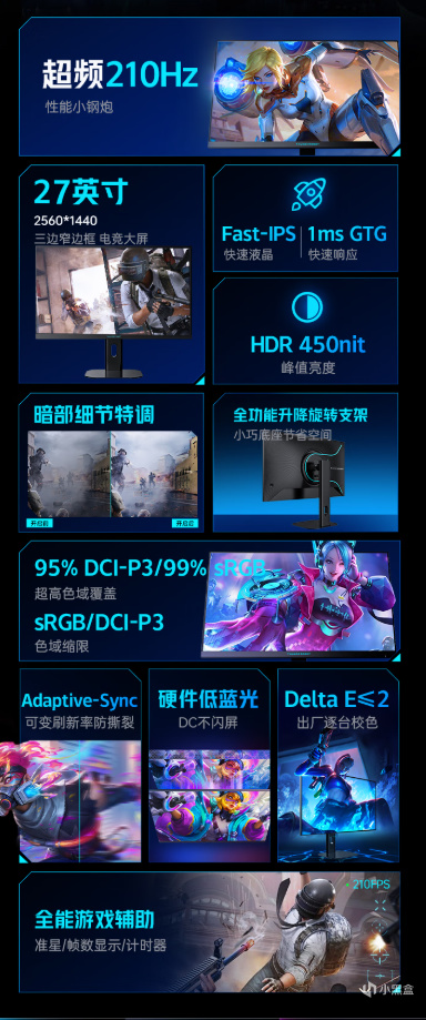 雷神 ZQ27F210L 提供了27英寸2K分辨率和210Hz高刷新率的组合。再加上升降旋转支架和低蓝光认证,这个配置既能满足日常办公时看文档、做表格分屏操作也不拥挤和影音的清晰度需求,也能应对大部分游戏场景,而且比同尺寸 2K/165Hz 机型多 50Hz 刷新率,还是可调节的支架,性价比899元的价格使其成为入门级市场的水桶机。