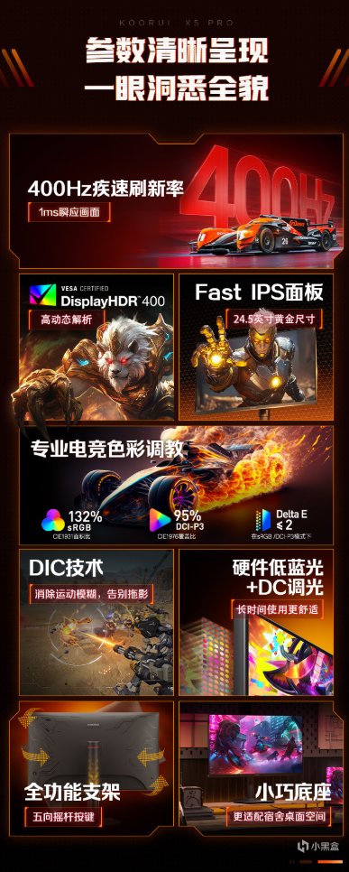 科睿 X5 PRO 则将刷新率拉到了400Hz,并且实现了0.1ms GTG的极速响应。罕见的 “400Hz 高刷 + Fast IPS 面板” 组合 ,覆盖 100% sRGB 色域,既拥有 TN 屏级的 0.1ms 极速响应,又有 IPS 屏的广色域,平时玩游戏流畅,偶尔看电影、修图也不偏色,对于追求极致流畅和快速响应的竞技玩家,它在参数上更具吸引力,价格也保持在很有竞争力的水平
