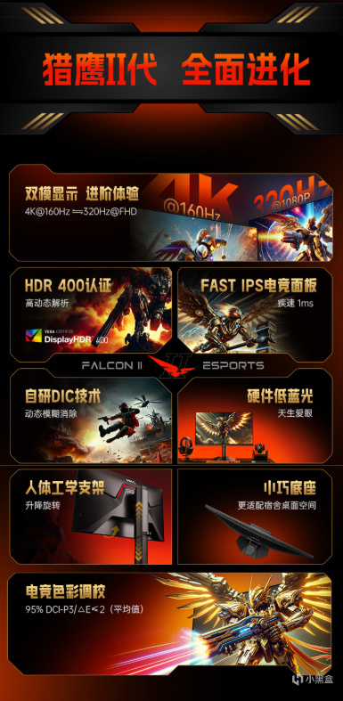 这款显示器的最大亮点在于其双模的设计,玩《黑神话:悟空》等 3A 大作时,切 4K/160Hz 模式,细节拉满、光影细腻,可以在4K超清分辨率160Hz下享受极致画质,玩《CS2》时,也可以一键切换到1080P320Hz,流畅度不输纯竞技显示器。HDR 400 认证让暗场细节更清晰,晚上玩游戏不用怕 黑处看不到人。一台显示器,两种顶级体验,完美解决了玩家在画质和帧率间的选择困难症。