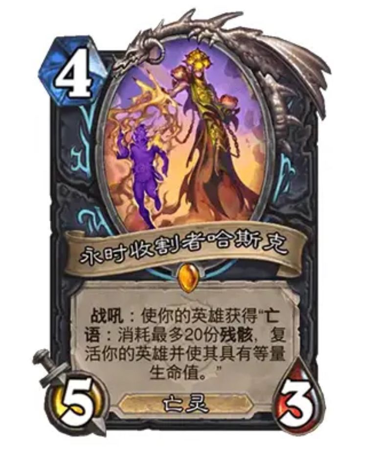节奏的拖拉导致DK需要依靠卖血量来缓解前期压力,而且很容易被otk卡组克制(法强德)。这张新卡首次提出的英雄亡语复活,可以让DK很好地破解各种otk卡组带来的绝望,以及更多操作的空间。