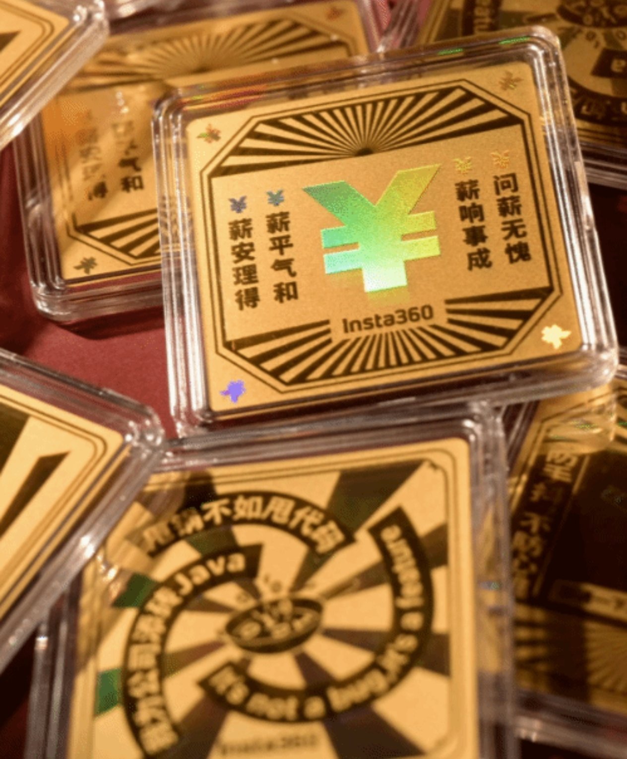 影石公司的“黃金文化” 不僅限於鍵帽,還包括爲結婚或生育的員工發放足金金幣、年會抽獎送50克金條等。這種獨特的獎勵機制體現了公司“員工發展第一”的理念。