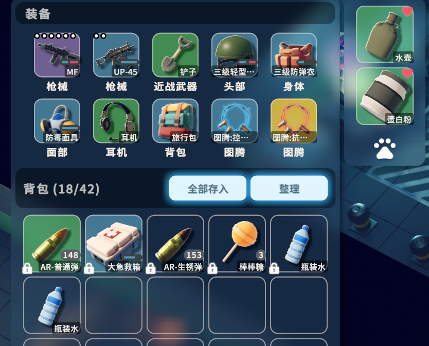 頭盔和衣服儘量到三級,面部固定防毒面具,揹包儘量到旅行包。圖騰的話看大家前兩個地圖的積累,有啥帶啥。揹包固定推薦一個大急救箱+AR普通彈+棒棒糖+水壺+蛋白粉。如果想要帶雙MF,建議再鎖一組AR生鏽彈。