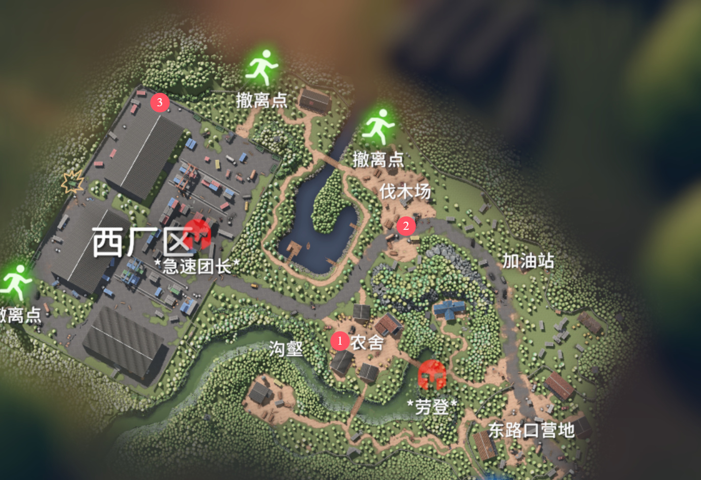 倉庫路線需要我們依次到西廠區的三個入口踩一下點,這個從地圖上可以一目瞭然的找到兩個,就是小二標記的①和③。部分小夥伴可能會把廠區後面的爆破點當成入口,而浪費時間,實際位置是在廠區東南角也就是標記②的地方。