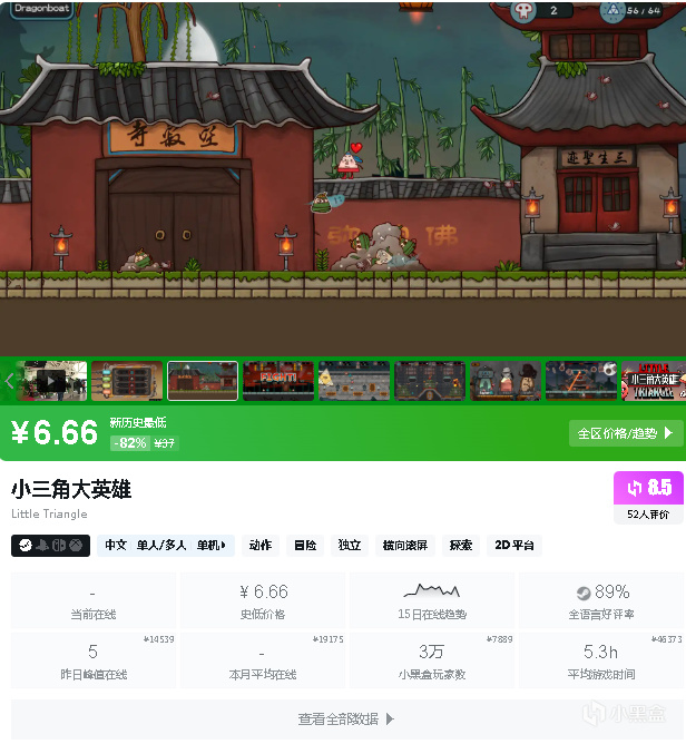 在众多平台游戏中,《小三角大英雄》拥有最完整的平台游戏体验。所有三种游戏模式,包括单人模式、本地合作模式和本地迷你大逃杀模式,都经过精心打磨,令人捧腹!我们最初的目标是价格不变,但只提供单人游戏内容!我们听取了测试玩家的反馈意见,增加了热闹的多人游戏内容!所有内容在发布前都经过了大量玩家的测试和打磨,以确保其趣味性!