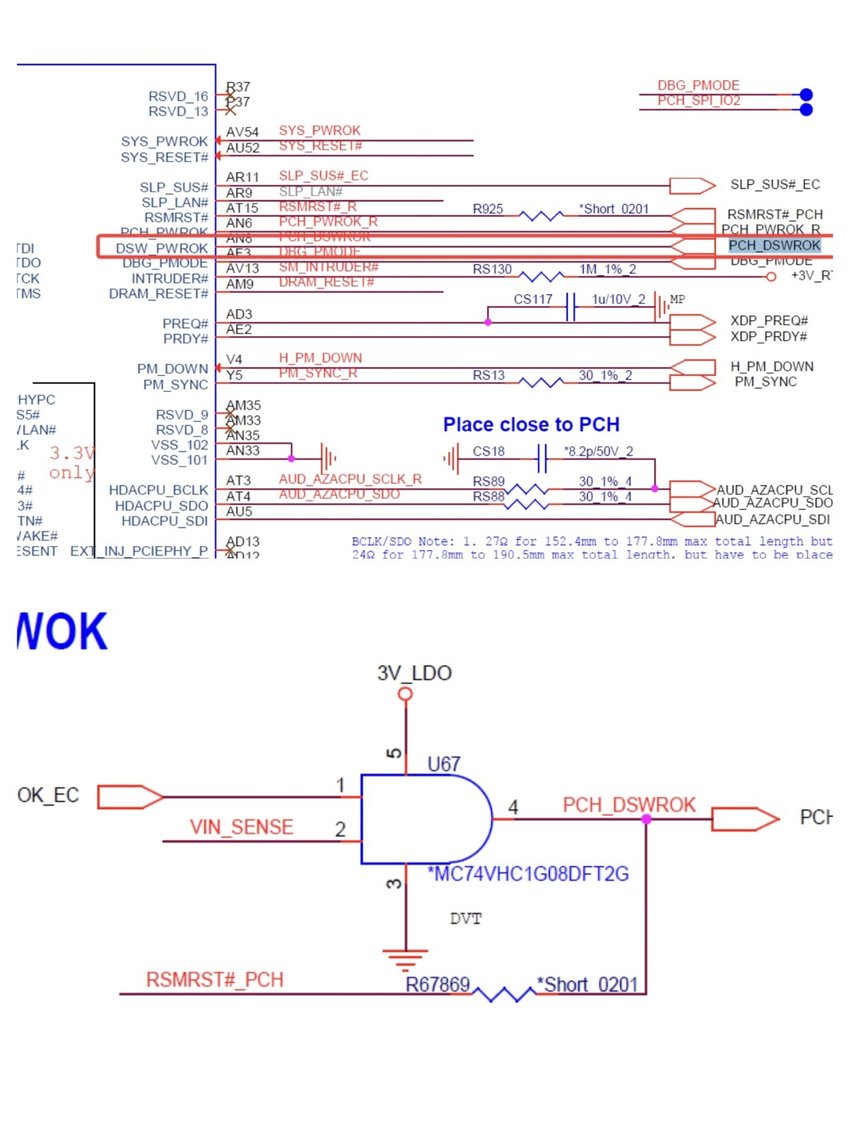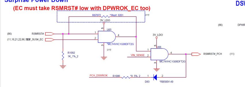 DSW_PWROK看图4可知,连接的是名为PCH_DSWROK的信号,图4下半部分是它的来源,U67是一个与门,只有1,2脚都为高电平的时候它才能在4脚输出高电平,也就是说只有当VIN_SENSE(19V电压检测正常),EC检查VCCDSW_3P3正常后PCH_DSWROK才能为高电平,但是注意与门的型号MC74VHC1G08DFT2G前面有个*代表不上件,也就是没有实装,再看下面*short表示这个信号是和RSMRST#_PCH用一坨锡短接到一起的,也就是说这个本子不支持深度待机。