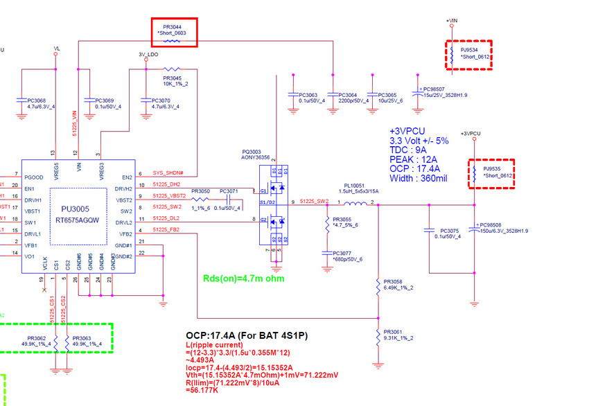 3.3V供电是由PU3005型号为RT6575AGQW的供电芯片产生的。