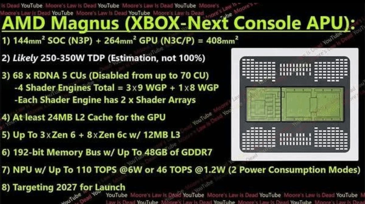 近日多位xbox高管透露将亏本出售次世代Xbox主机,下一代Xbox主机(代号Magnus)采用双芯片设计,搭载基于Zen 6架构的CPU和多达68个计算单元的RDNA 5 GPU,配备GDDR7内存,性能预计超越PS6约15-35%。