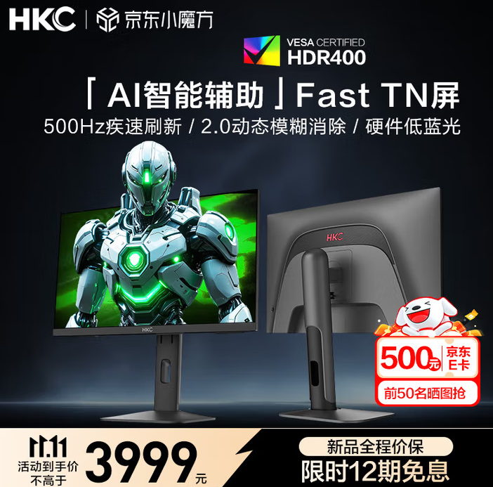 最后压轴介绍的是一款HKC家的新品,24.1寸、1080p,原生500Hz刷新率的Fast TN屏,而且是友达的原装模组。这些参数一摆出来就说明了它的身份:一款专为FPS重度玩家设计的显示器!