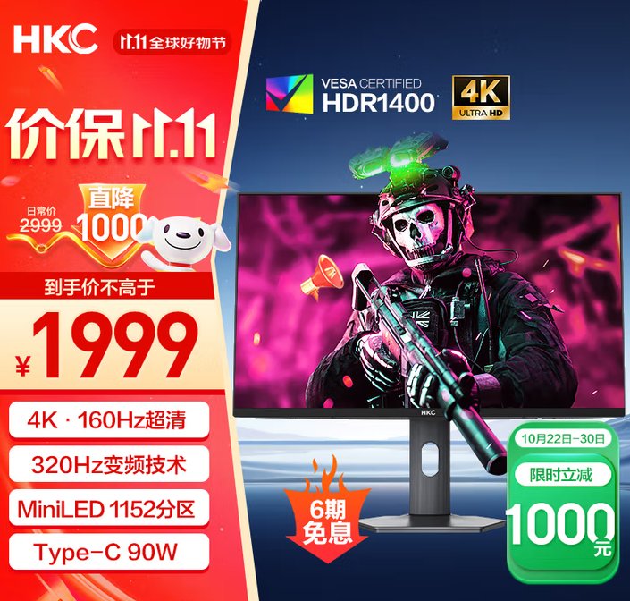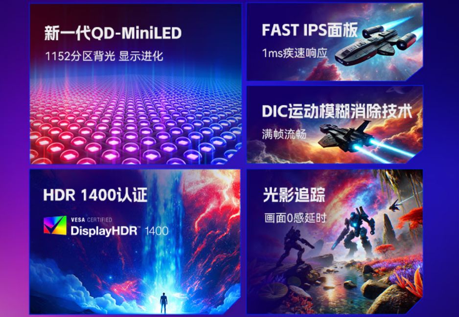 关键信息:27英寸4K 160Hz双模320Hz QD量子点MiniLED广色域HDR1400认证