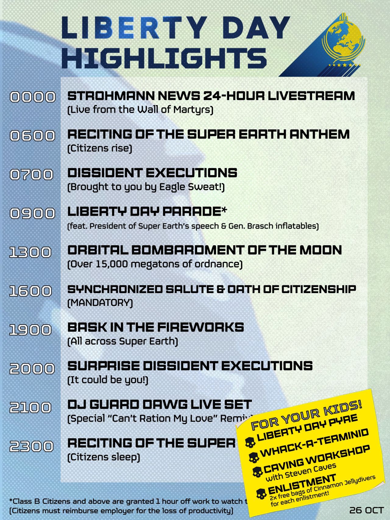 每年的10月26日都是超级地球的管理式民主纪念日。在这一天,官方会庆祝民主精神驱散黑暗,走向自由的光明。