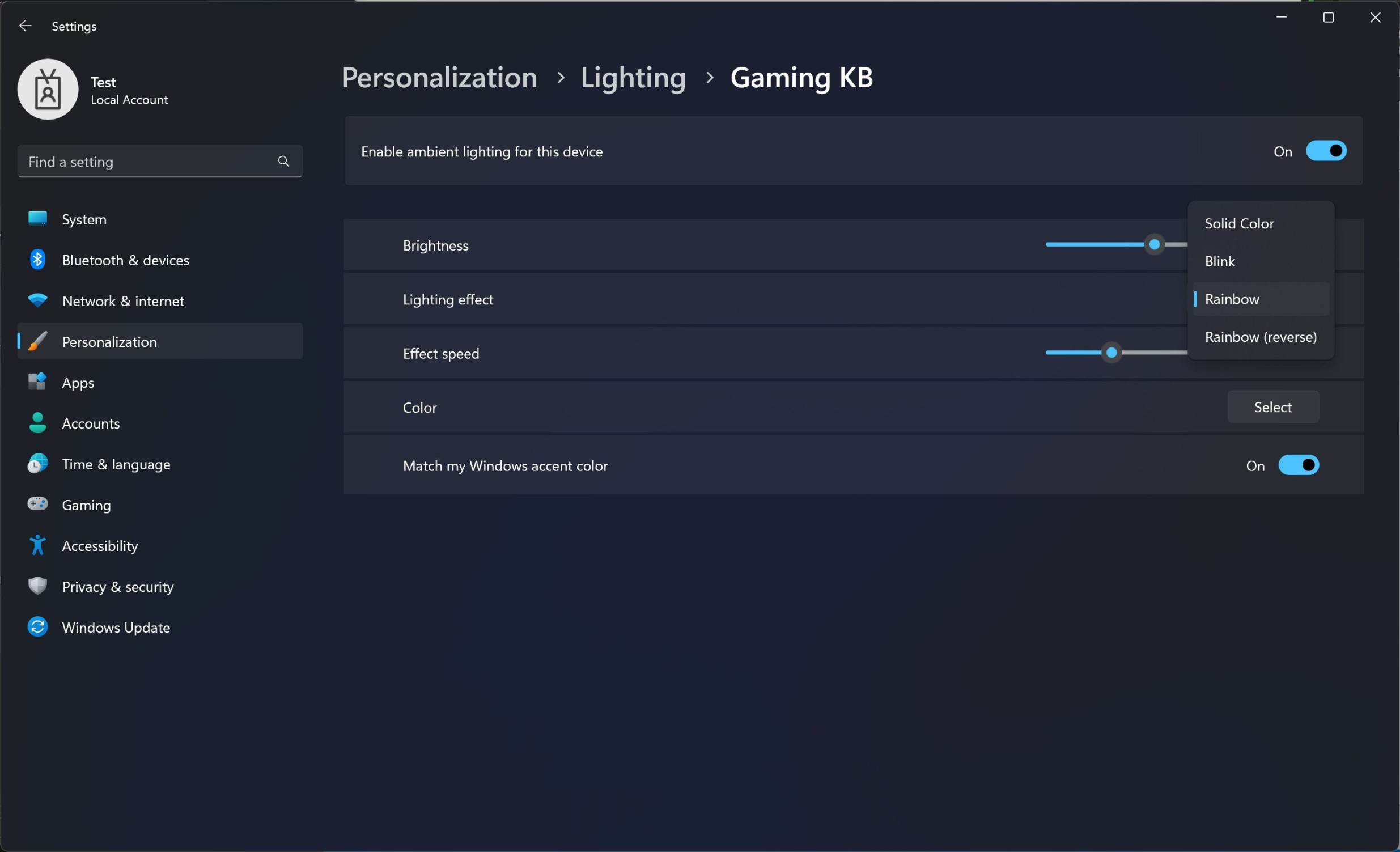Twitter用户Albacore已经发现了将这种新的照明体验集成到Win11系统最新版本中的早期工作。其可以用于控制亮度,照明效果,速度,颜色,甚至可以将您的配件颜色和Windows主题颜色相匹配。