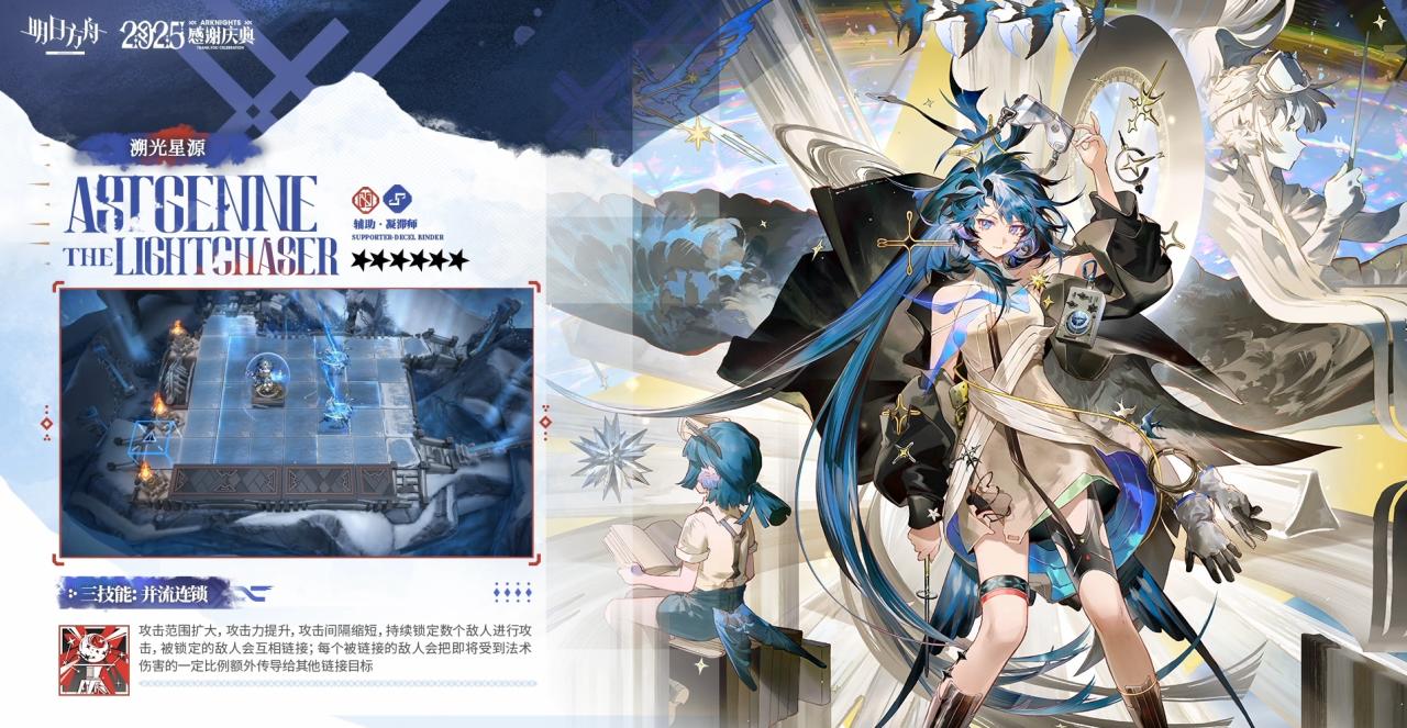攻击范围扩大,攻击力提升,攻击间隔缩短,持续锁定数个敌人进行攻击,被锁定的敌人会互相链接;每个被链接的敌人会把即将受到法术伤害的一定比例额外传导给其他链接目标。