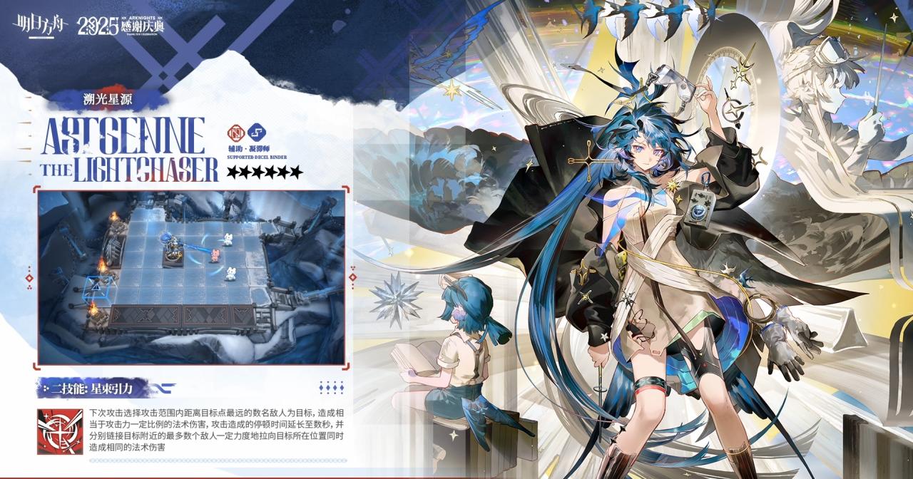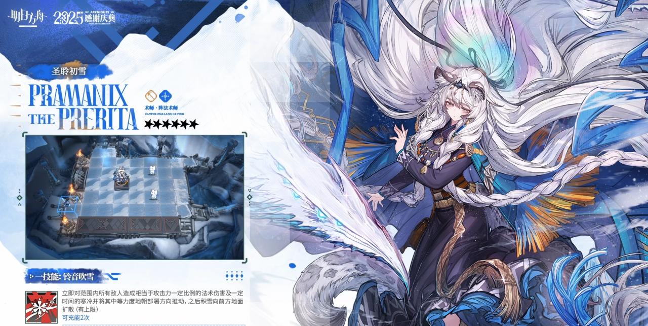 对前方推测为4名敌人造成相当于攻击力一定比例的物理伤害,使其在一定时间内陷入寒冷状态且隐匿失效;待部署区距【风雪之眼】最近的1名干员费用减少(优先选择右侧近卫/术师/狙击干员),使14费用的【风雪之眼】左侧所有干员部署时以自身攻击力施放一次本技能的范围效果(最多叠加2次)可充能2次