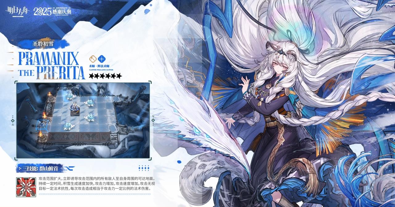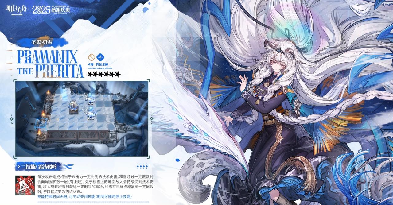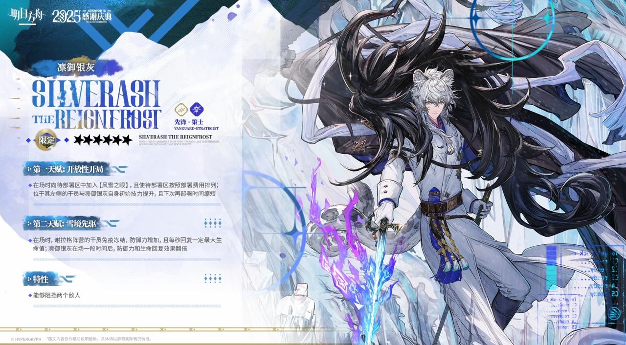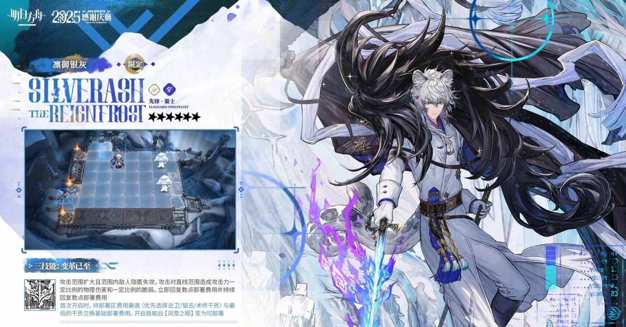 第二天赋:雪境先驱 在场时,谢拉格阵营的干员免疫冻结,防御力增加,且每秒回复一定最大生命值;凛御银灰在场一段时间后,防御力和生命回复效果翻倍