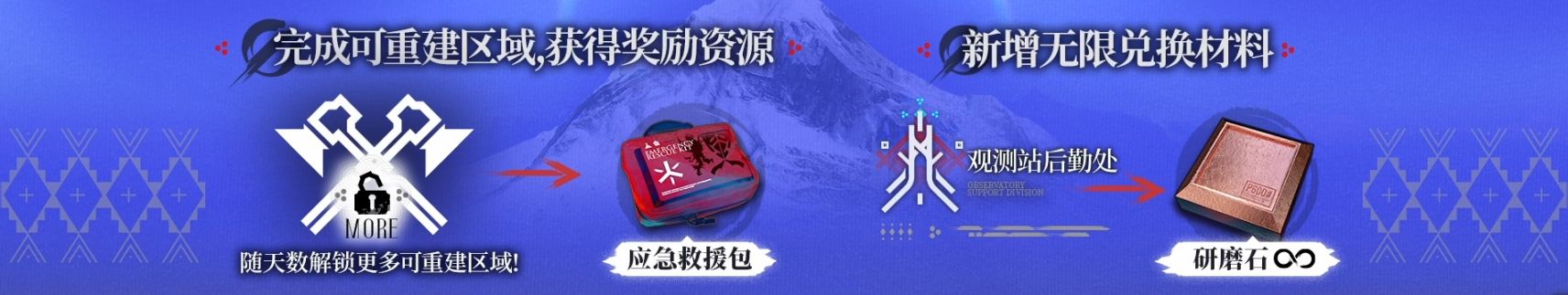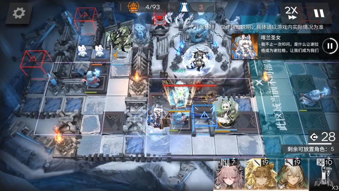 活动机制,圣女像的方向是雪崩的方向,雪崩会造成真伤+特大力度推人。敌人进入雪崩区增加装置预警值,到上限则触发雪崩。重量越高预警值越高。并且把干员朝雪崩方向推1格。会让地面干员上高台,高台到地面。如果后面一格是可部署地面则部署,如果是不可部署地面受到巨额伤害+眩晕。