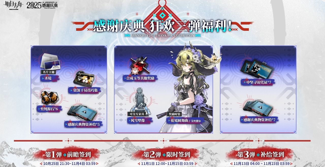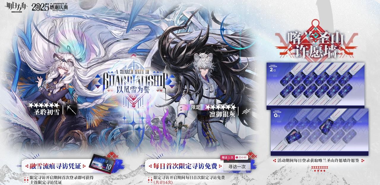 登录24抽、幸运墙和耀骑士临光降井。夕到等新年降井。前瞻签到6源石,限时签到400玉、ALL给1200玉和2个中坚寻访凭证。补给签到7个中坚寻访凭证。