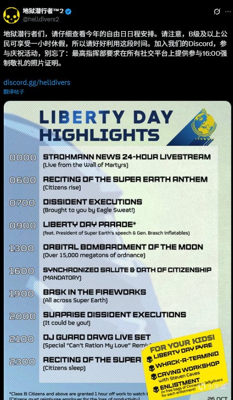 此外,官方還將每年10月26日設爲“超級地球解放日”——一個在遊戲世界觀內紀念民主精神與自由的日子。