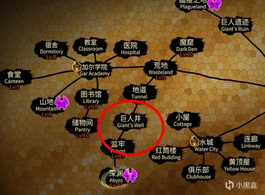 首先,你練練級,然後來到巨人井這個位置。這裏有五個像戟把的柱子。