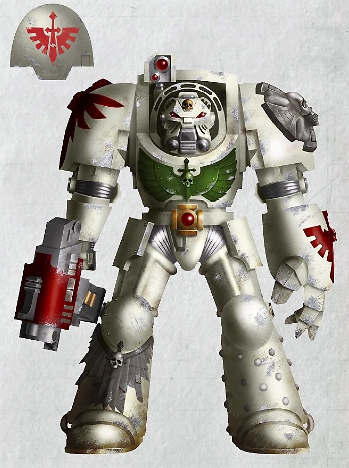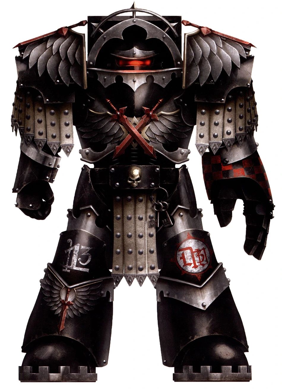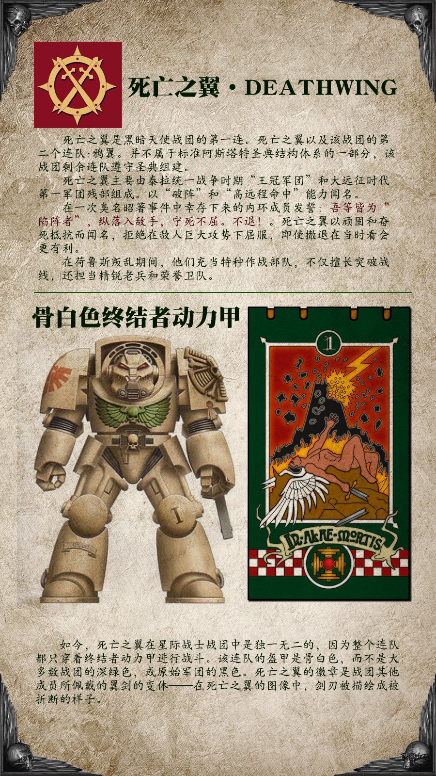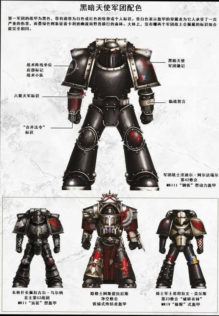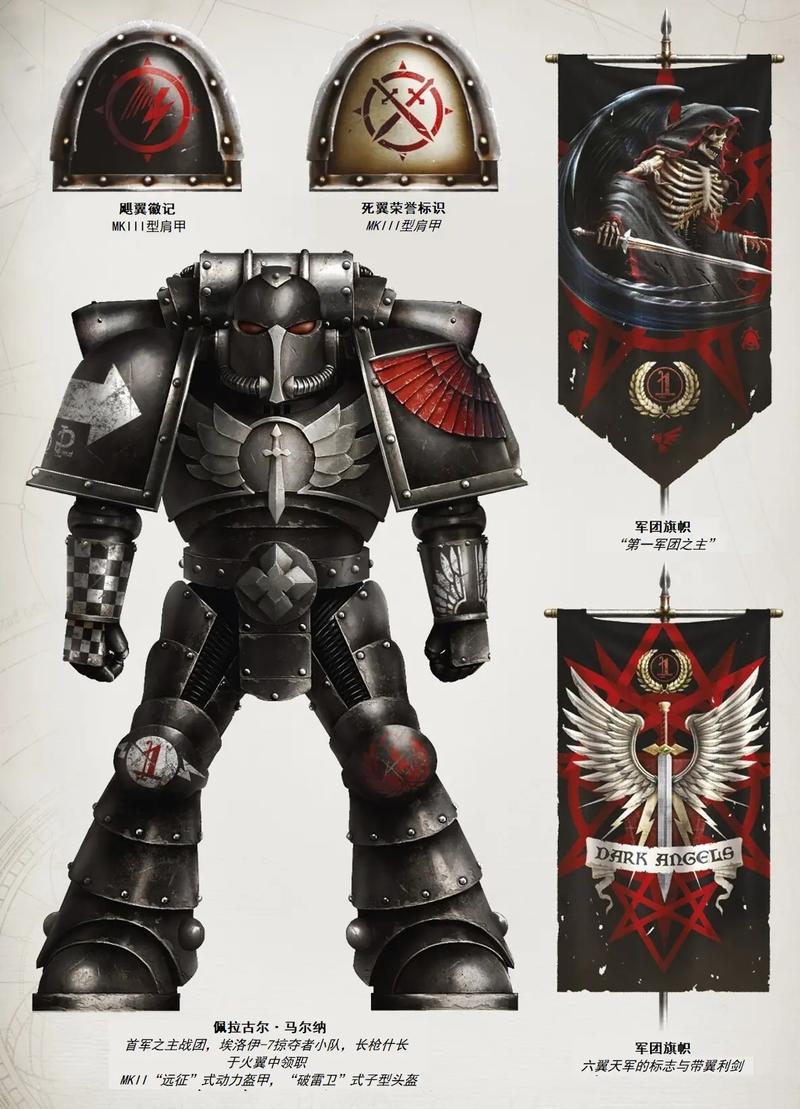 复仇天使(Avenging Angels):复仇天使的身上体现了第一军团顽强的奉献精神,他们被认为是帝国中最坚韧的战士,曾多次将自己置于生存机率接近于0的可怕战场中