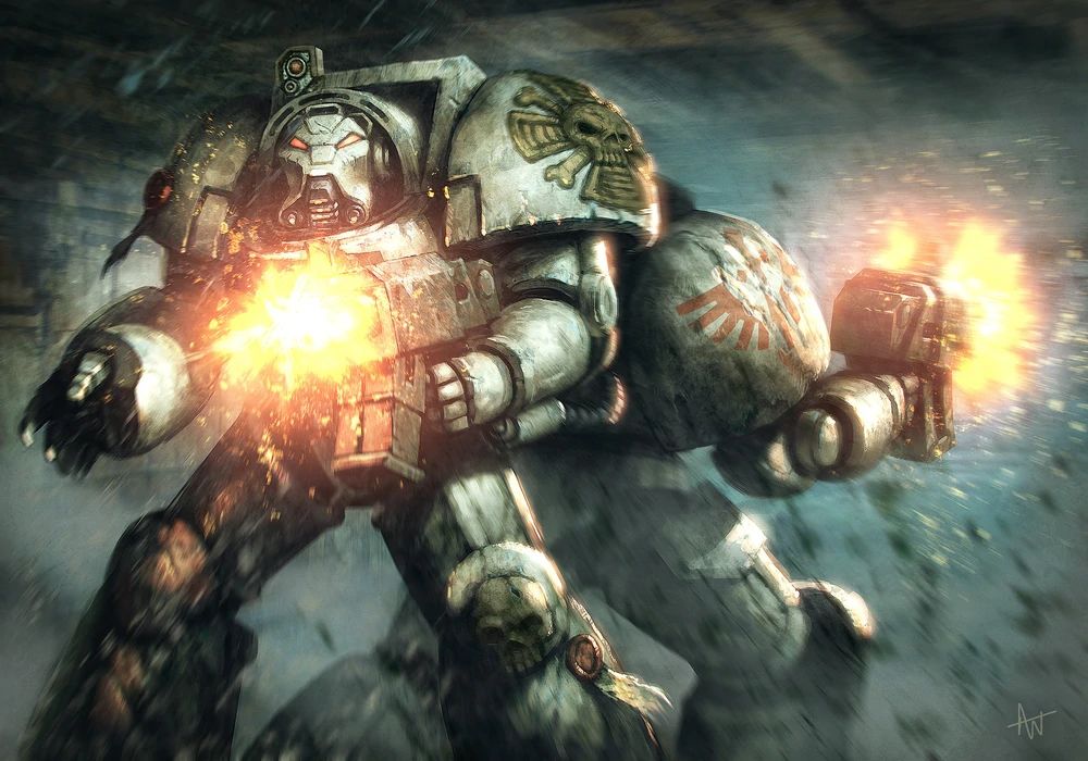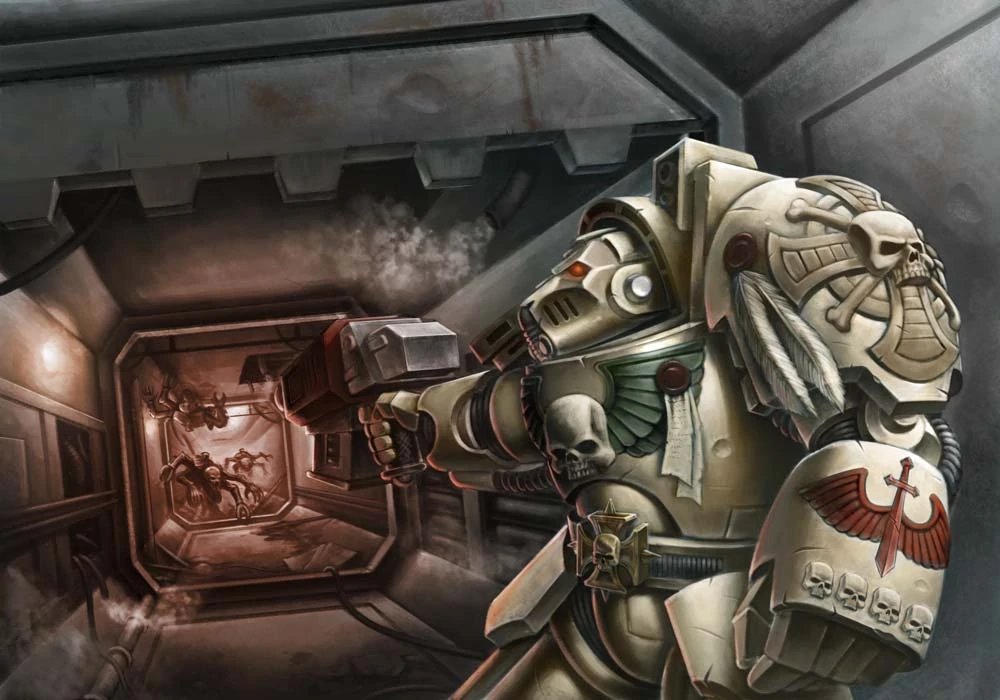 - 终结者甲:全员标配战术无畏型装甲(Tactical Dreadnought Armor),部分精锐成员可穿戴铁骑型装甲(Cataphractii Pattern)——其分层板甲可抵御泰坦级武器攻击,甚至在荷鲁斯叛乱时期曾正面硬抗战帅的热熔炮。