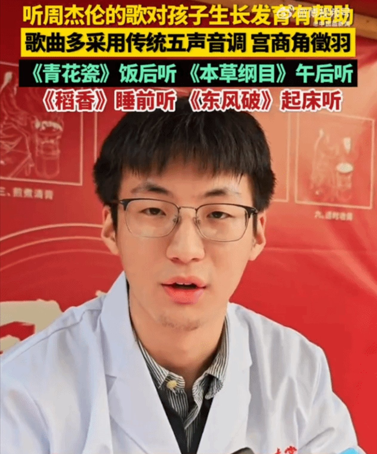 浙江杭州某中医馆医师近日表示,多听周杰伦的歌对儿童生长发育有帮助。据介绍,周杰伦的许多歌曲采用传统的五声音阶创作,恰好与中医的“五音疗疾”理论相吻合。