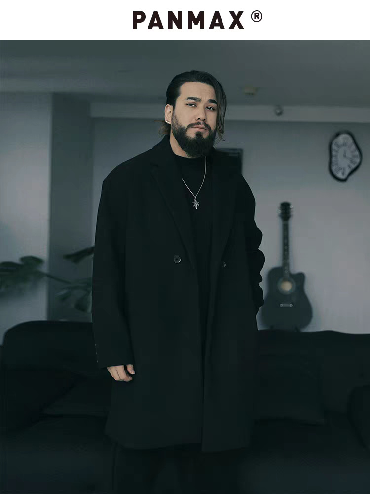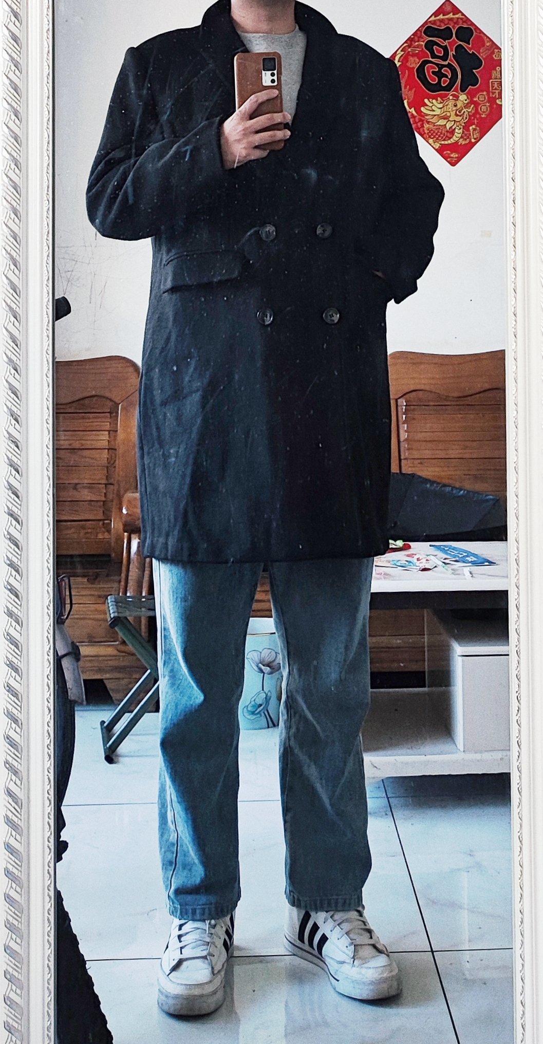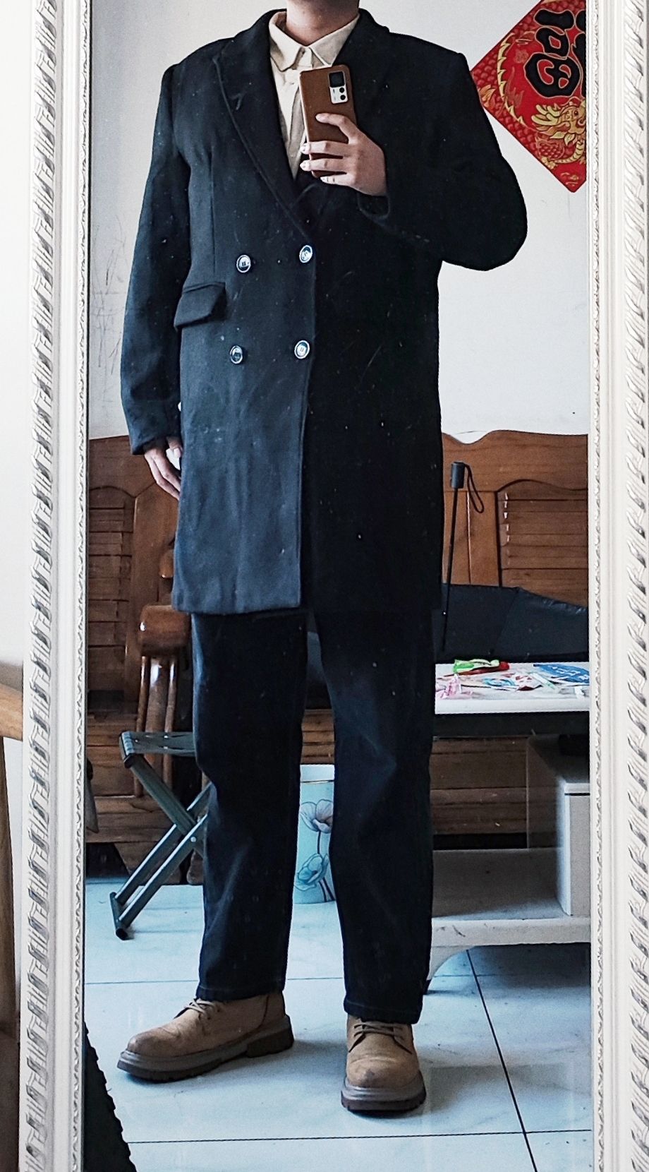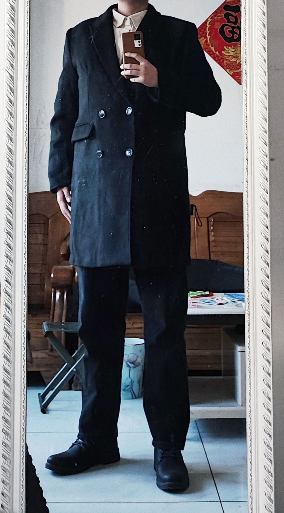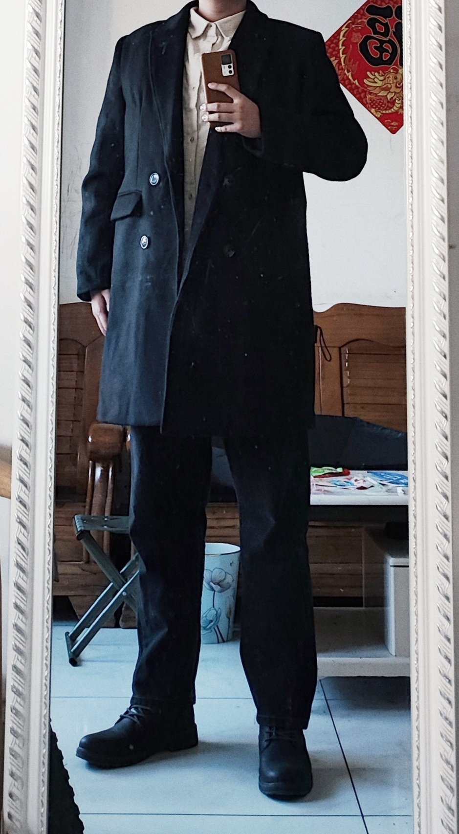 下面我搭了一天黑色牛仔褲,如果有黑色西裝褲效果會更好。不過大衣整體偏松一點,較緊的西裝褲估計穿起來不好看。肩膀非常硬挺,非常顯肩寬。搭配黑色皮鞋和馬丁鞋都很好看。內裏搭配高領衛衣或者襯衫都可以