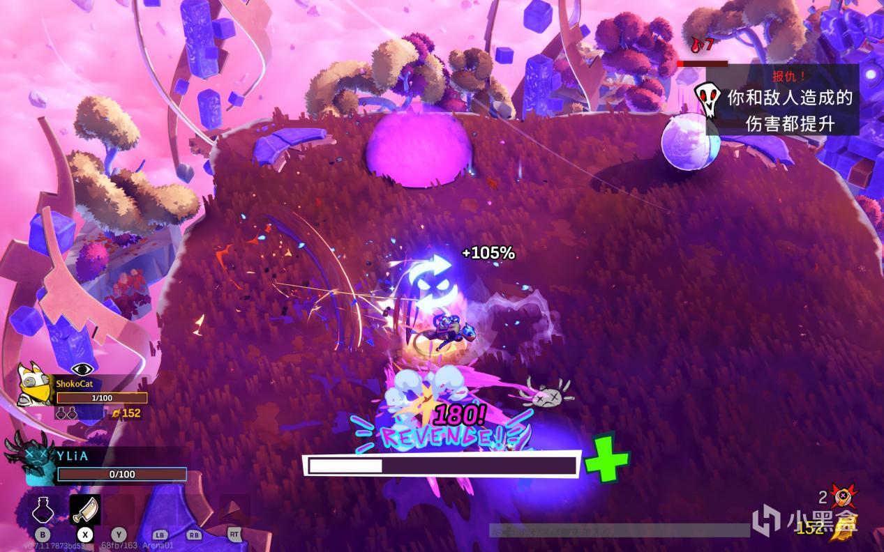 最後不得不提的就是本作中的重頭戲——聯機玩法,本作最多可支持三人聯機,在週年更新之後聯機出現了較嚴重的卡頓問題,希望可以在後續修復。作爲一款可以聯機的動作肉鴿遊戲,本作很多細節都在鼓勵聯機,獎勵的共享、怪物的數量不會因人數的增加而增多,血瓶可以共用。比較值得一提的一點是玩家需要具有良好的心態與抗壓能力,在隊友死亡之後,其他玩家都會進入“復仇”模式,在這個階段玩家和敵人的傷害都會大幅提高,但相對應的只要被敵人碰到就會輕易死亡,在這個階段下擊殺十個敵人之後就能讓隊友以50%的血量復活,因此多人遊戲會更加考驗玩家之間的相互配合,例如可以三個人一個人選增加傷害,一個人選道具冷卻減速,最後一個人選擊殺敵人回覆血瓶,良好的配合會增進遊戲體驗,也可能因爲配合不當或網絡問題適得其反,希望官方能在後續的更新中持續優化。