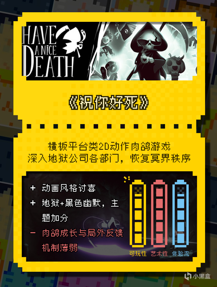 横板平台类2D动作肉鸽游戏。扮演忙到没边的死神老板,手持招牌镰刀,深入地狱公司各部门,惩戒那些捣乱的下属,恢复冥界的秩序。黑白漫画风与动画表现力很好,搭配恰到好处的工业摇滚氛围音乐,幽默风趣的员工对话和碎片化叙事,让本作的整个观感非常独特。