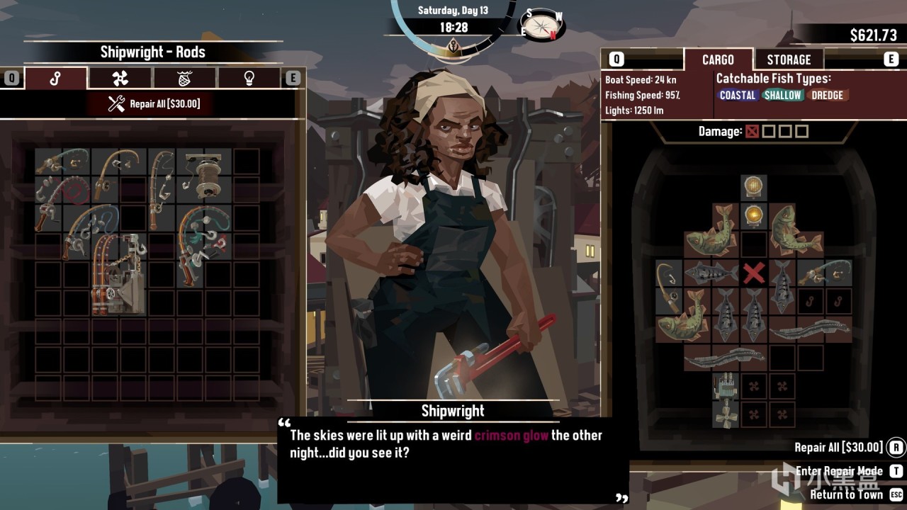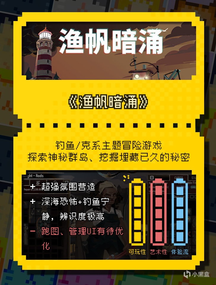 游戏在氛围营造上无疑是非常成功的,独特的艺术风格和文本代入感十足,巧妙地将钓鱼的禅意宁静与深海克系主题的恐怖融合。从玩法渐进来看,前期捕鱼赚钱、升级船只的体验非常流畅,随着新道具和玩法的解锁,正向反馈十足,节奏很好。从弱小渔船到驰骋海域的成长感,尤其是新怪物突袭的刺激,都构成了其辨识度极高的游戏标识。因此基本上说,本作的框架是极其优秀的。资源管理上面的交互内容有点影响体验,整体瑕不掩瑜,值得入手。
