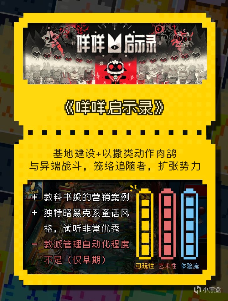 我还是比较早玩到本作的,后面很多内容就没有体验了。在后期更新的那些内容之前,本作的缺点还是不少,比如主角写作教主、读作铲屎官,众多事务都要亲力亲为,非常头疼。整个游戏循环虽然有趣,但中后期遭不住多个运营,且运营的反馈也非常有限。不知道后面的版本有没有改良这个问题。尽管如此,我觉得仅单凭本作极其迷人的主题调性就完全值得一试。