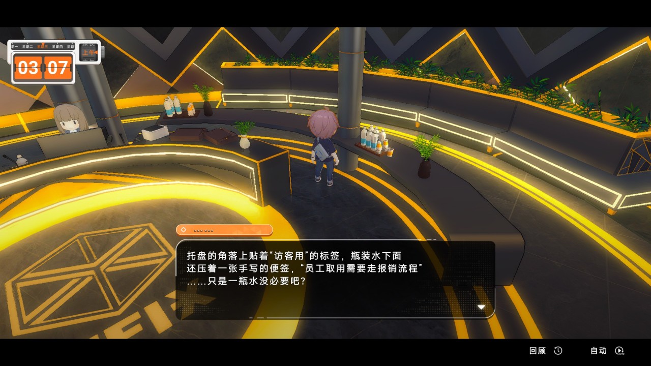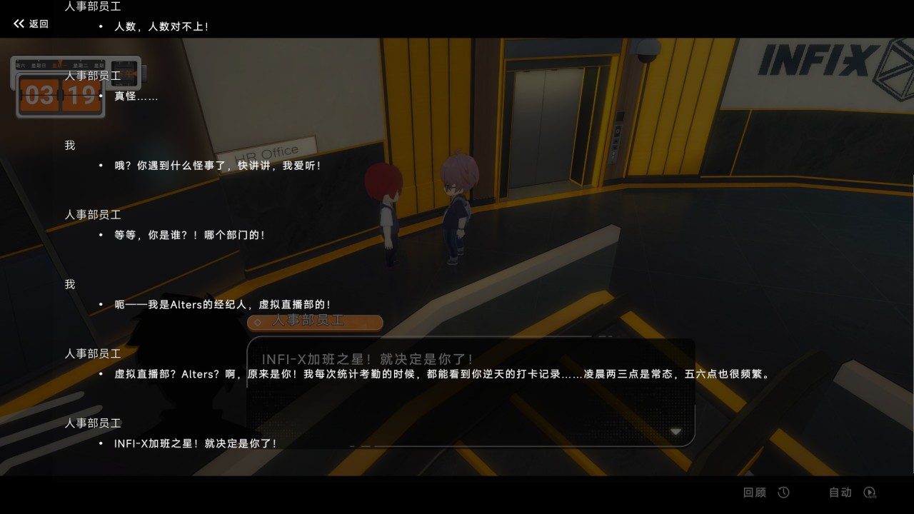 身在INFI-X公司里,并不每件都是糟心事,在工作之余的日常里,游戏也安排了许多非常非常有趣的日常事件,玩家在“自由行动”环节,可以自由探索公司本部及其周边设施,“发现生活中的美好”,其中不乏一些非常流行的梗的复现,同样也包含与阿尔特斯团队内少女的日常事件。
