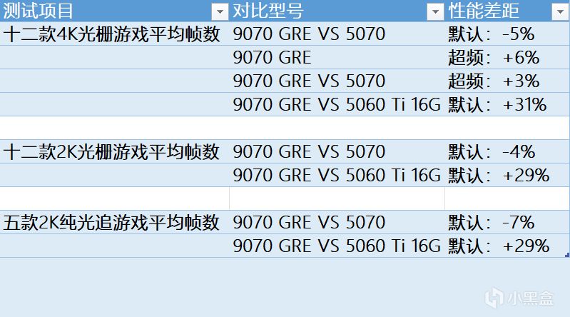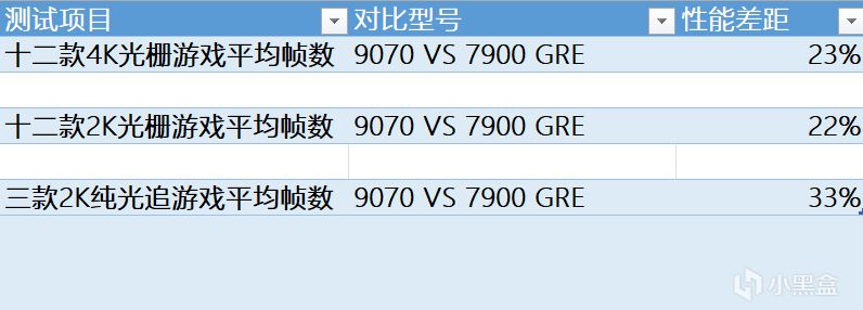 具体性能方面,硬核这里只有RX 9070 VS RX 7900 GRE的数据,4K和2K领先幅度分别达到23%和22%,而光追作为后辈来说自然提升不小,2K环境下达到33%提升幅度。RTX 5070的光栅性能,其实也就小幅度领先RX 7900 GRE,这样一对比就很清晰了吧。