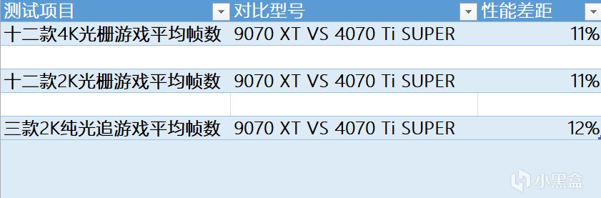 具体数据方面,这里对比的是RTX 4070 Ti SUPER,RX 9070 XT在4K光栅、2K光栅和2K光追分别可领先11%、11%和12%幅度,换句话来说,RX 9070 XT性能基本等同于RTX 5070 Ti(结合鸡血驱动优化)
