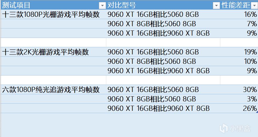 至于RX 9060 XT 16GB就是完全碾压了,1080P和2K光栅领先RTX 5060幅度分别达到16%和19%,再施加显存压力的光追场景,差距直接拉到30%~
