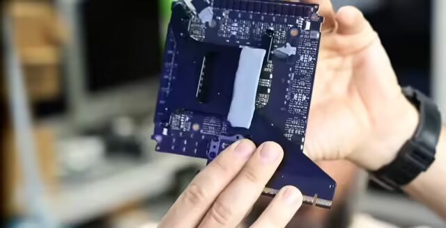 维修人员指出,这种设计虽然紧凑,但导致显卡内部连接极其脆弱。尤其是位于显卡背面的微型 PCIe 连接器,接口不仅体积小、结构密集,而且极易在拆卸过程中损坏。他在视频中展示了该连接器的细节,称其“针脚数量多到必须使用显微镜才能看清”。