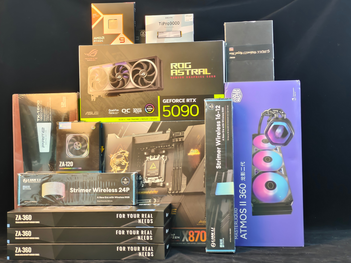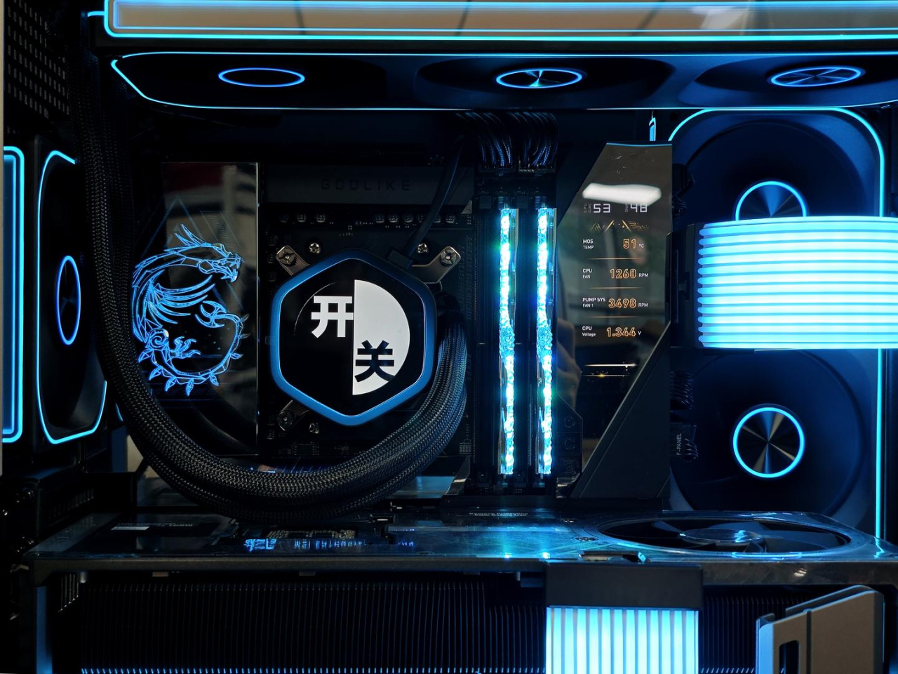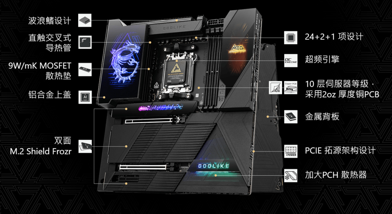 主板是X870E最强旗舰——MEG X870E GODLIKE(超神),无论是供电规格,还是三代龙魂动态屏幕,全覆盖金属装甲,扩展性拉满的接口,优秀的通道拆分,都突出一个无!敌!