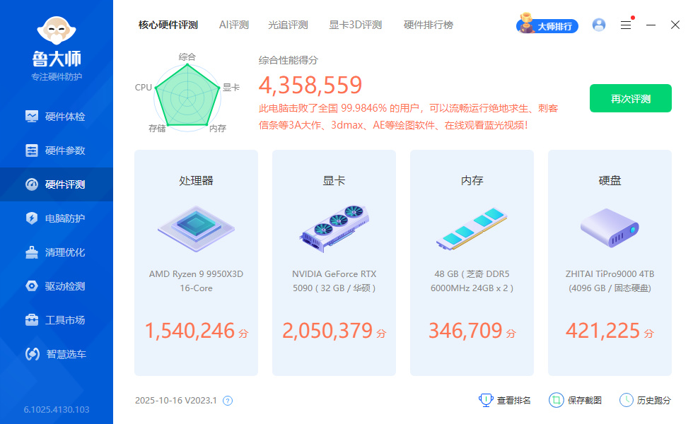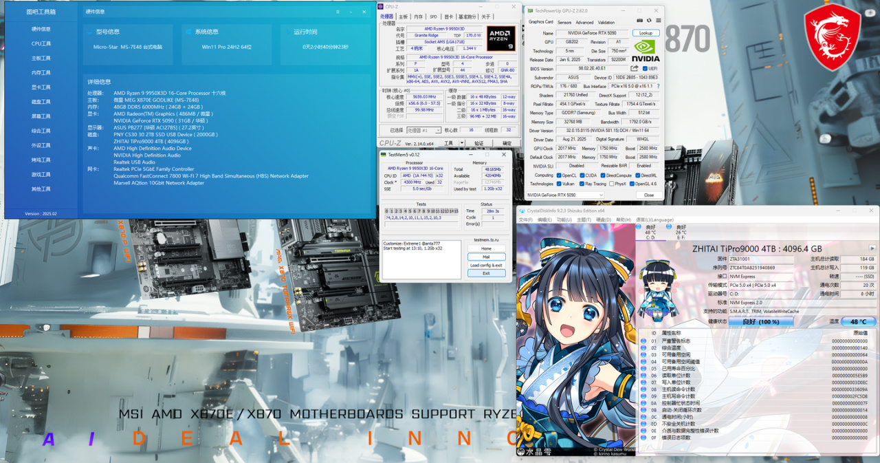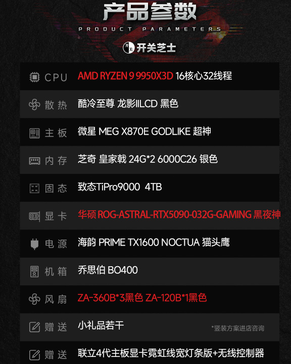 最后再介绍一下配置,这套配置是老哥自己选的,CPU不用多讲——AMD 锐龙 9 9950X3D 暂时的地表最强,无论生产力,还是关掉一个CCD去当983使用都是强的可怕,唯一缺点是太贵,