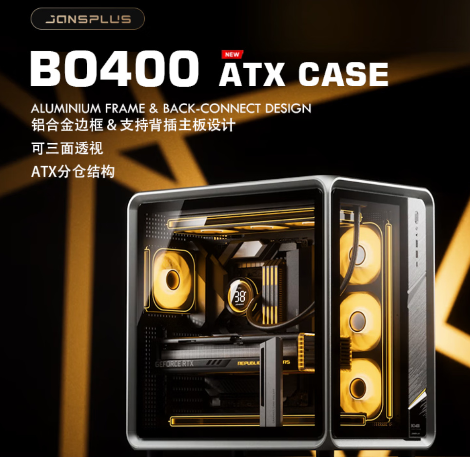 最后就是机箱——乔思伯 BO400,时下最火爆的海景机箱,经常缺货,我推荐过无边框版本,老哥表示有A柱的更有质感,铝合金阳极拉丝面板,全铝主体框架,可以切换成O11V那种三面侧透模式,支持背插,确实帅哇,希望乔思伯不要再搞饥饿营销,赶快开足马力生产吧