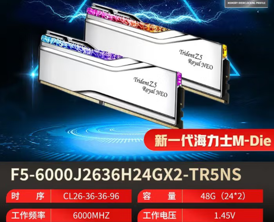 内存是——芝奇 F5-6000J2636H24GX2-TR5NS ,翻译过来就是 24G*2 6000 C26银色皇家戟。低时序可以保证在1080P的下的网游性能,(这位老哥两个显示器,一个1080P玩网游,一个4K玩3A )大容量可以保证轻度生产力也够用,192G、256G这种老哥表示不需要,够用就行