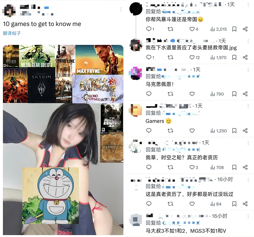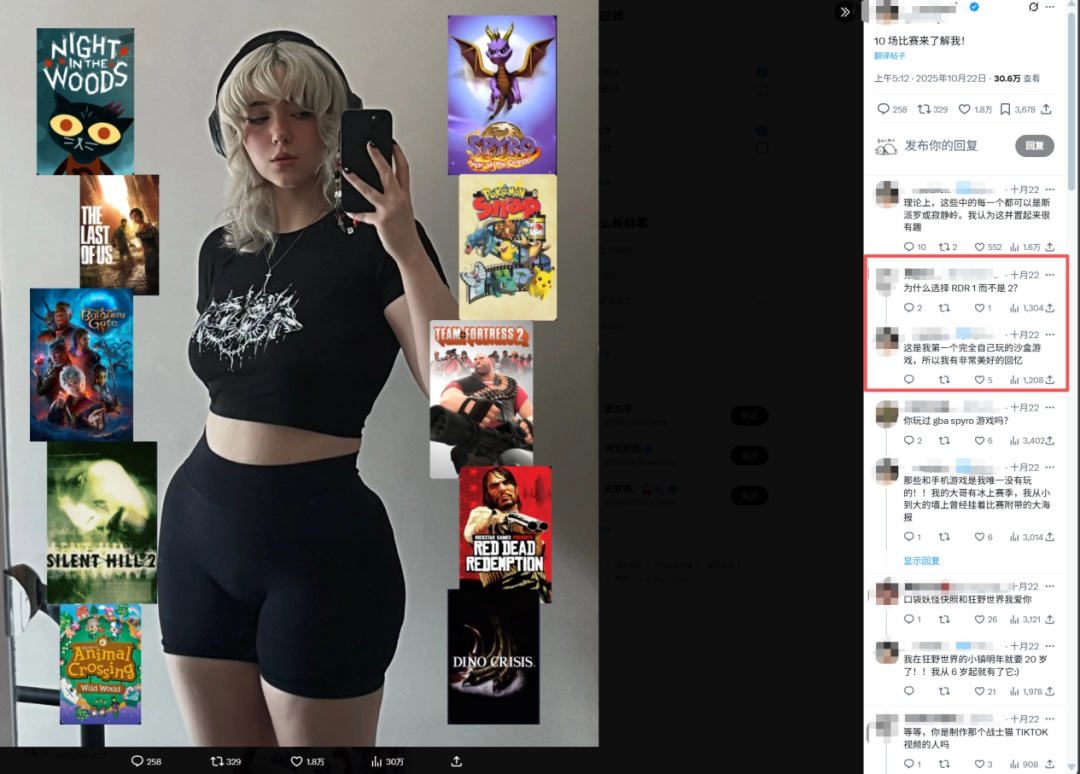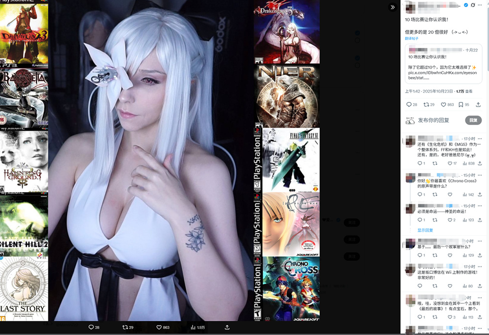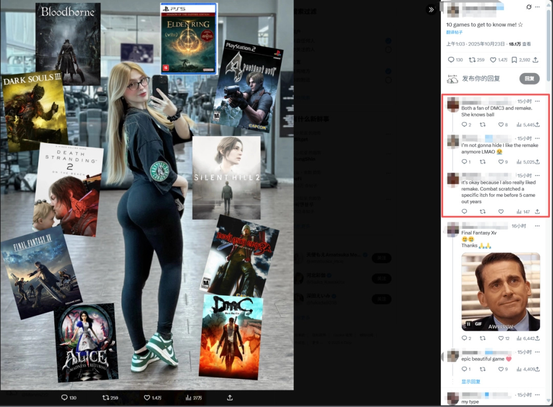 发的内容像福利姬,说的话像福利姬,连她的个人简介都写明了自己就是个福利姬,你原以为她就会收获一个福利姬该有的评论区,但当她发了张“10 games to get to know me”出来后,大家的关注点不是布料太少的僵尸娘,而是“哇哦!你的List里居然有《马克思·佩恩》”。