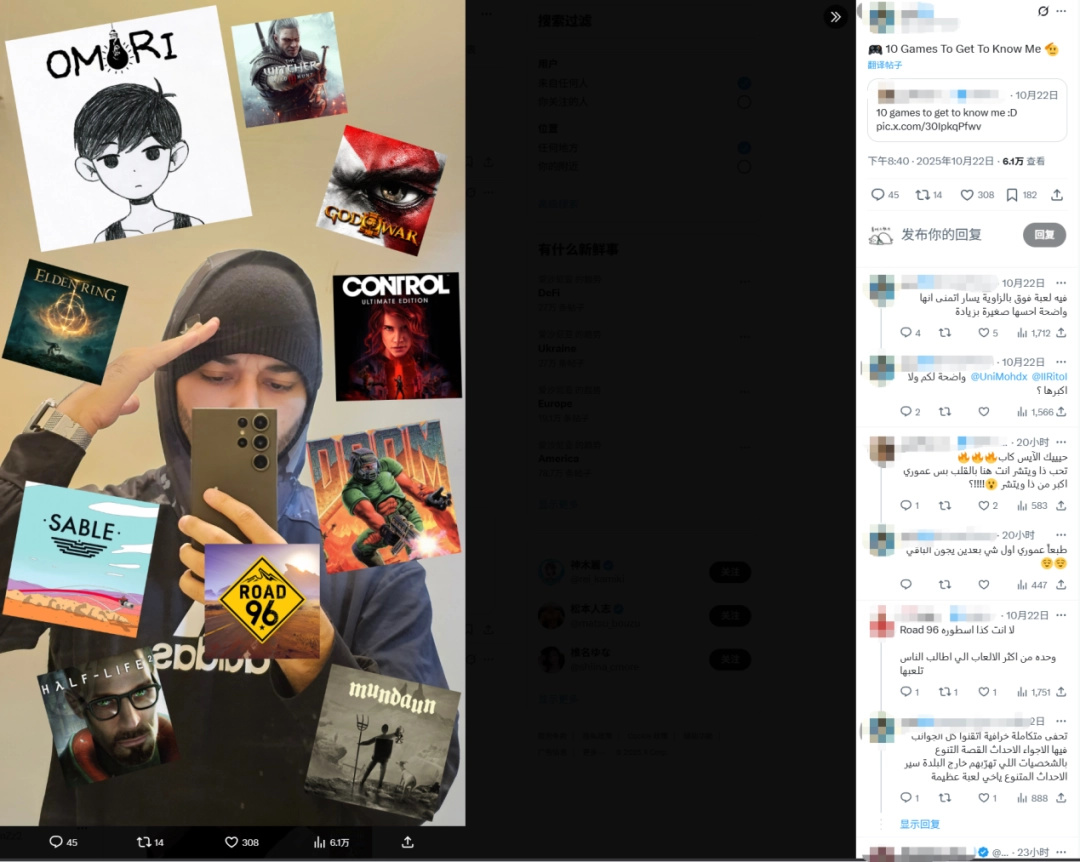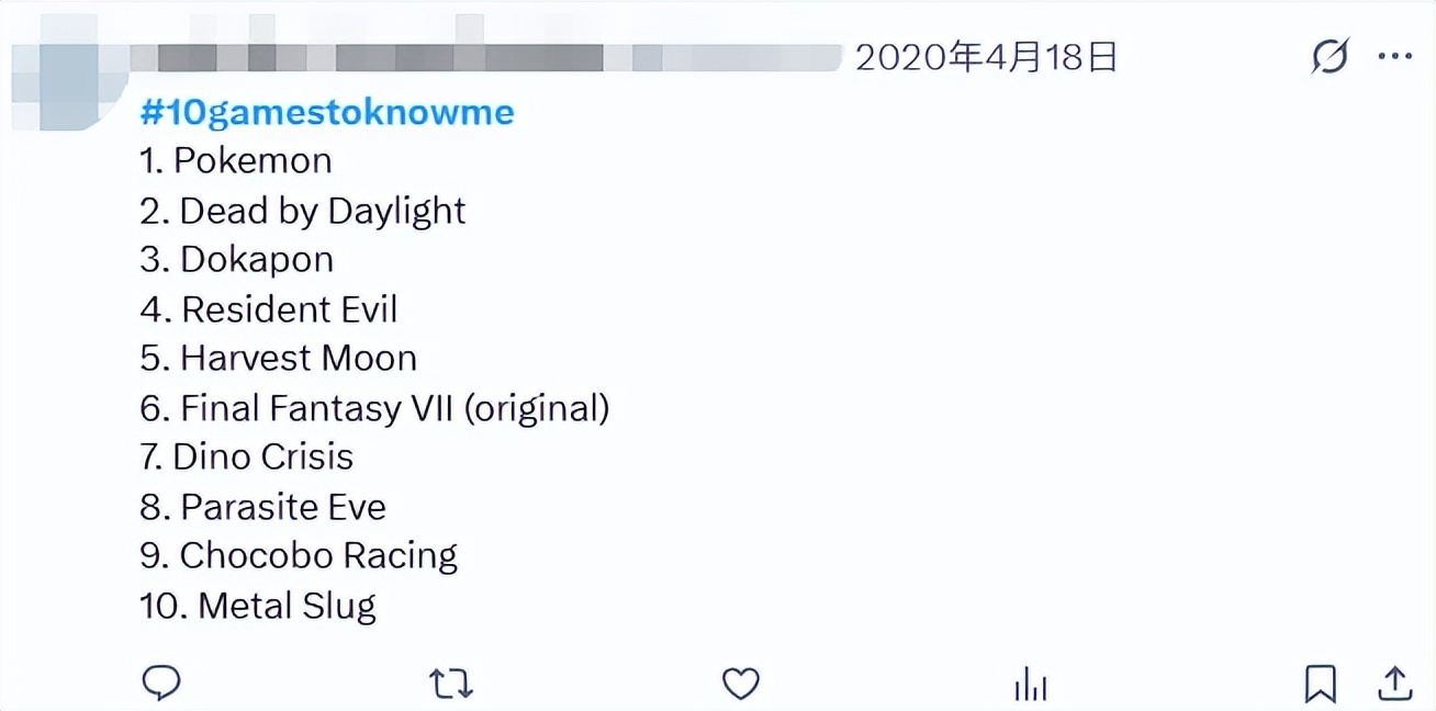 最近X上很流行一种帖子,叫“10 games to get to know me”,意思是给你列十款游戏让你了解我,非常典型的社交媒体活动。