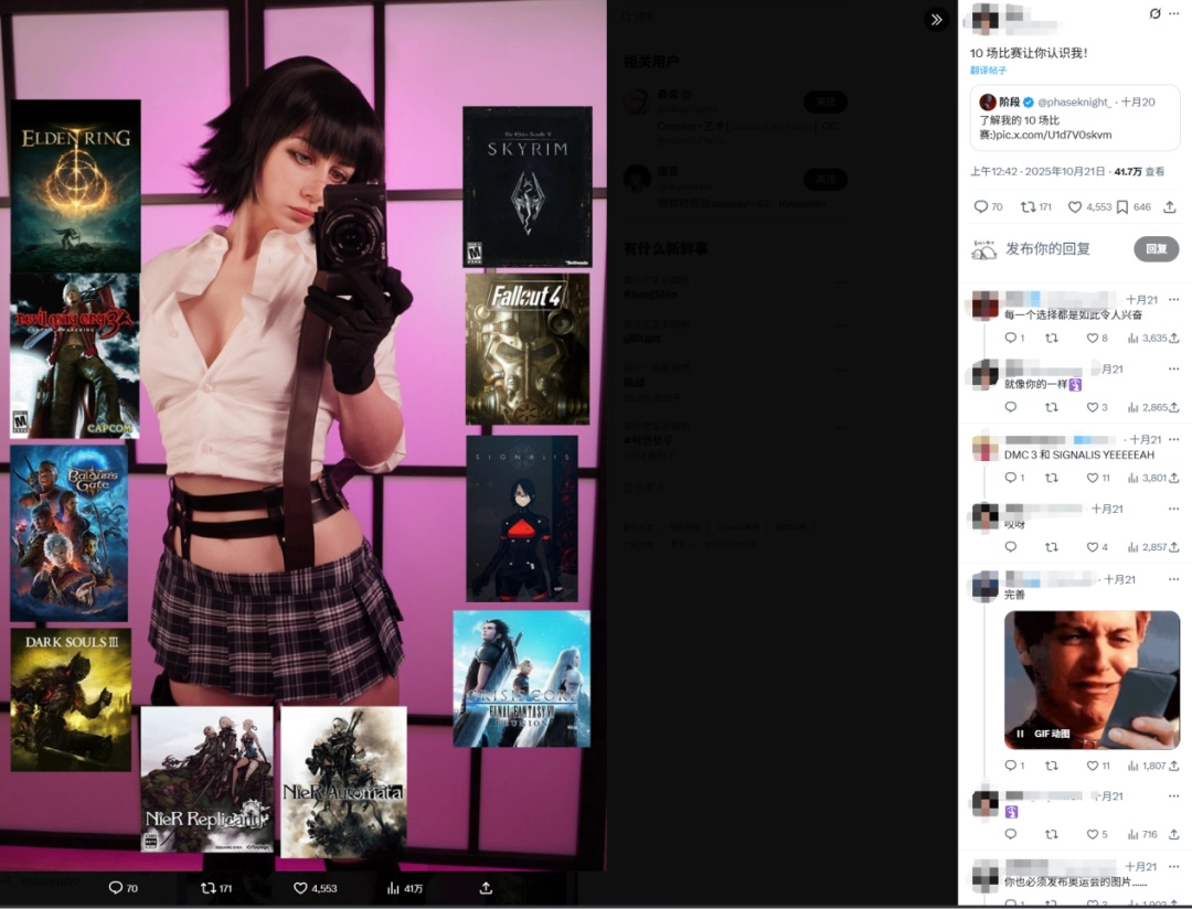 在《鬼泣3》的女角色蕾蒂的Cos照下,大家评判的不是Cos得有多么还原,而是在为Coser给出的List里,有着《鬼泣3》《SIGNALIS》这些完美戳中好球区的作品而欢呼。