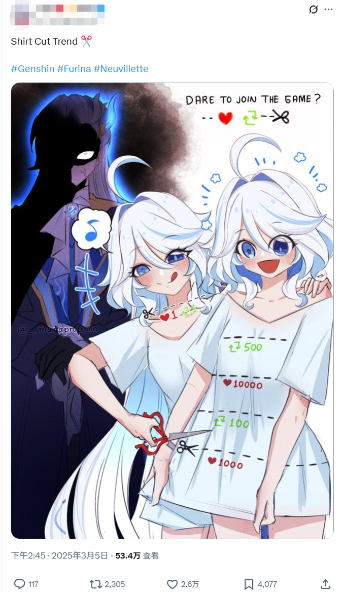 这种现象大家也都见怪不怪,在X这个平台上,与其说潮流总在往搞黄色的方向发展,不如说很多潮流的出现,就是为了让大家换个花样搞黄色。像今年上半年在X上流行过一种“剪衬衫”互动游戏,大多数就是PO张图或照片出来,在白T上画若干条虚线,然后根据点赞转发评论等数据一点点“沿虚线剪开”,是把LSP们钓翘嘴的又一小妙招。
