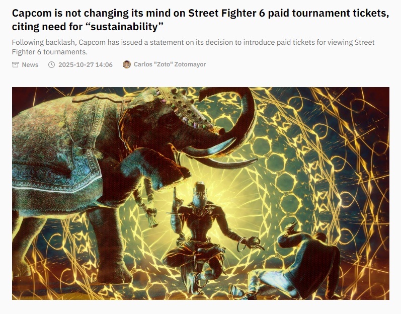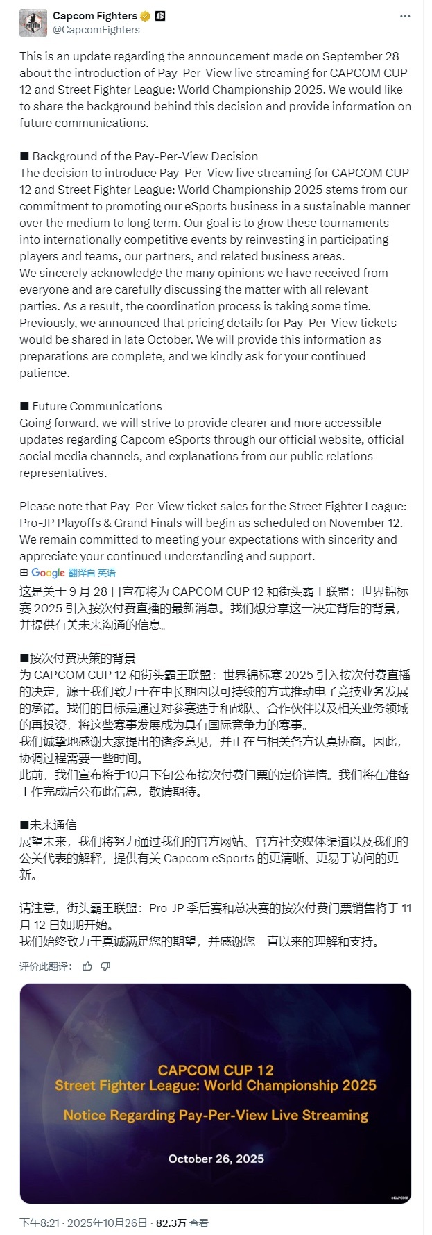 另外卡普空还表示,虽然第12届卡普空杯和SFL世界锦标赛决赛的按次付费门票细节尚未公布,但SFL:Pro-JP季后赛和总决赛的门票仍将于11月12日按计划开始发售。