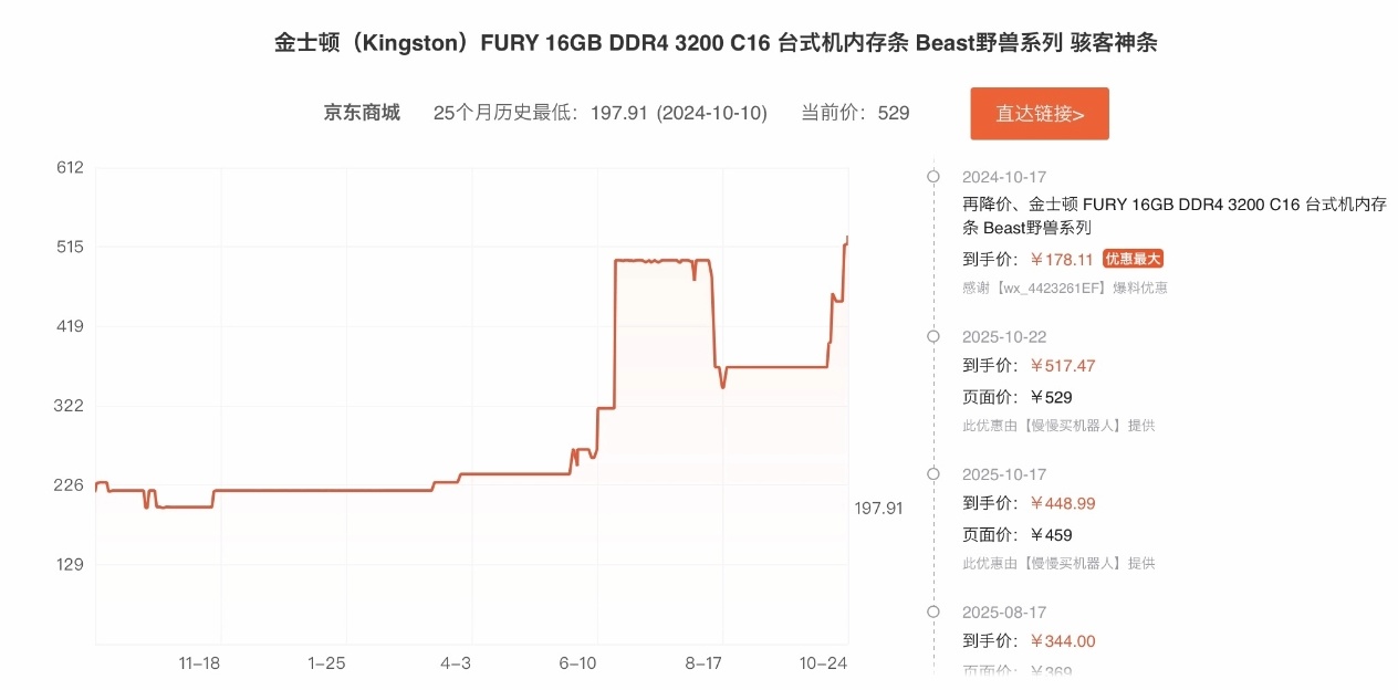 近期,DDR4内存条价格出现惊人涨幅。数据显示,一款16GB容量的DDR4内存条售价已从去年同期的178元飙升至目前的500元以上,部分品牌型号售价已达517元,涨幅超过两倍。