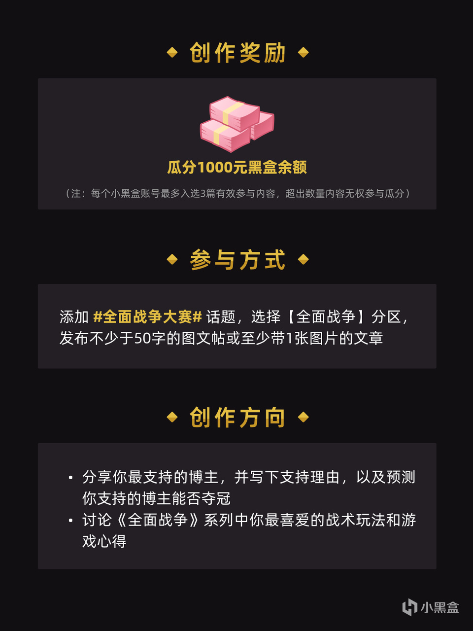 所有符合活動要求的作者均可參與,將有1000元黑盒餘額獎金供玩家瓜分。(注:每個小黑盒賬號最多入選3篇有效參與內容,超出數量內容無權參與瓜分)