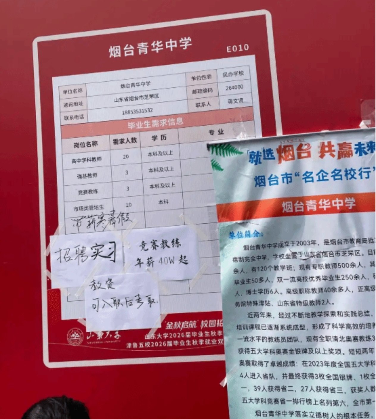 在山东大学近日举办的2026届毕业生秋季就业双选会上,烟台青华中学为竞赛教练开出了“年薪40万起”的优厚条件,却未能收到一份简历。