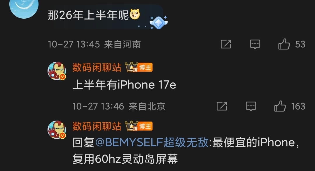 并且在下面评论区回复用户的留言中表达明年上半年将推出最便宜的iPhone17e,回归60Hz的灵动岛屏幕。