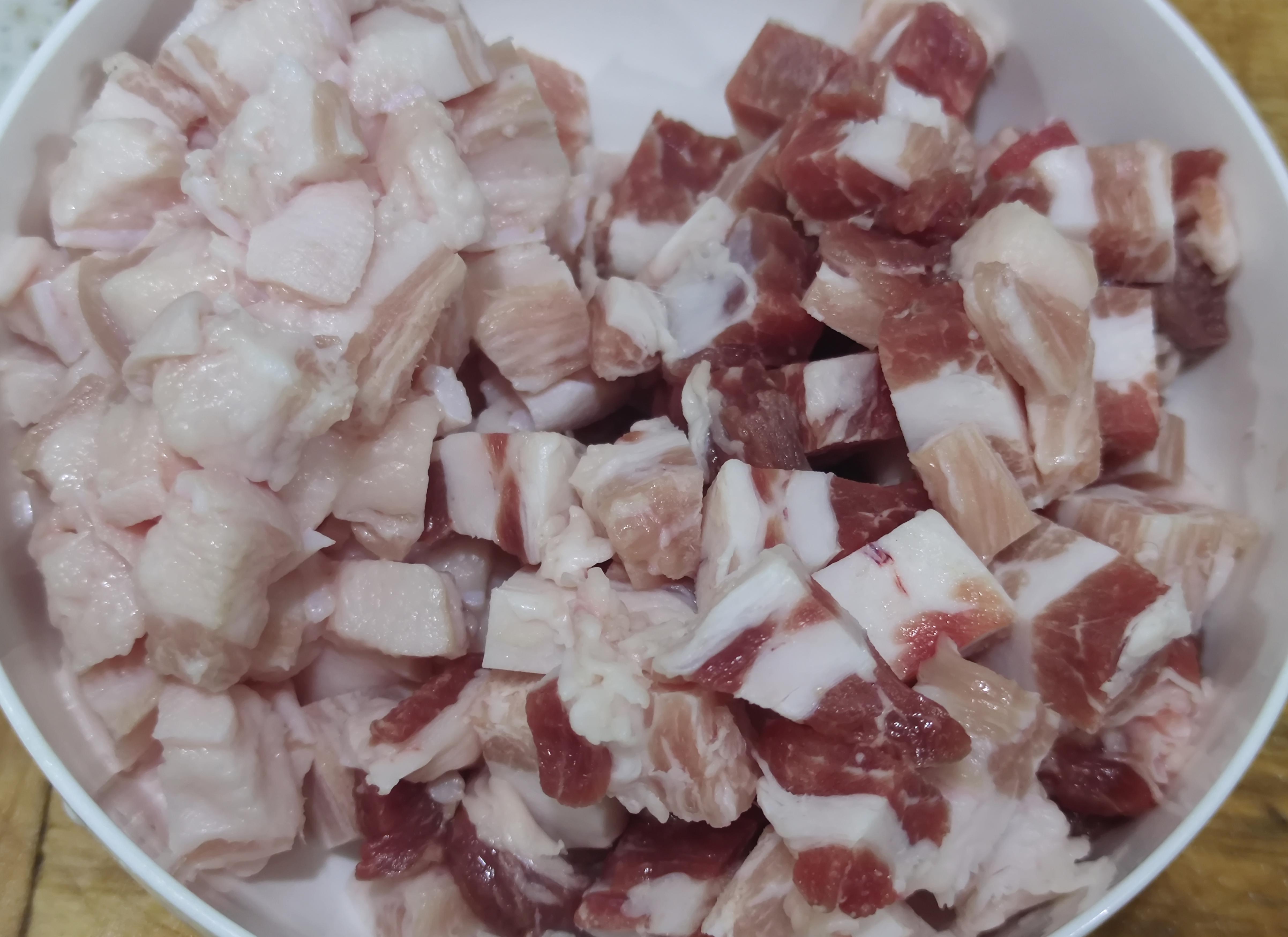 猪肉大约500g,切成大块肉丁,我这里用的五花肉有点太肥了,所以把肥瘦分开了一些。