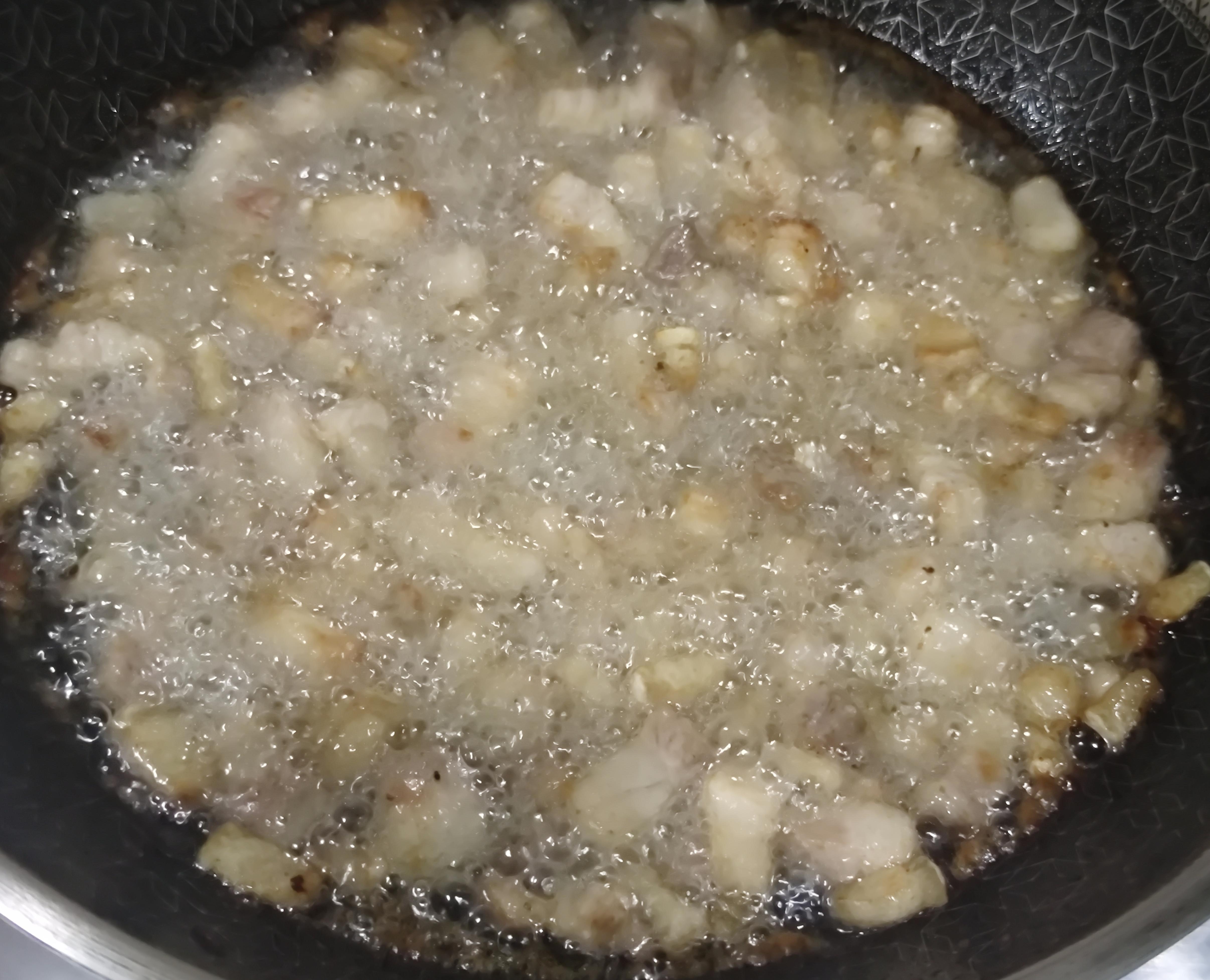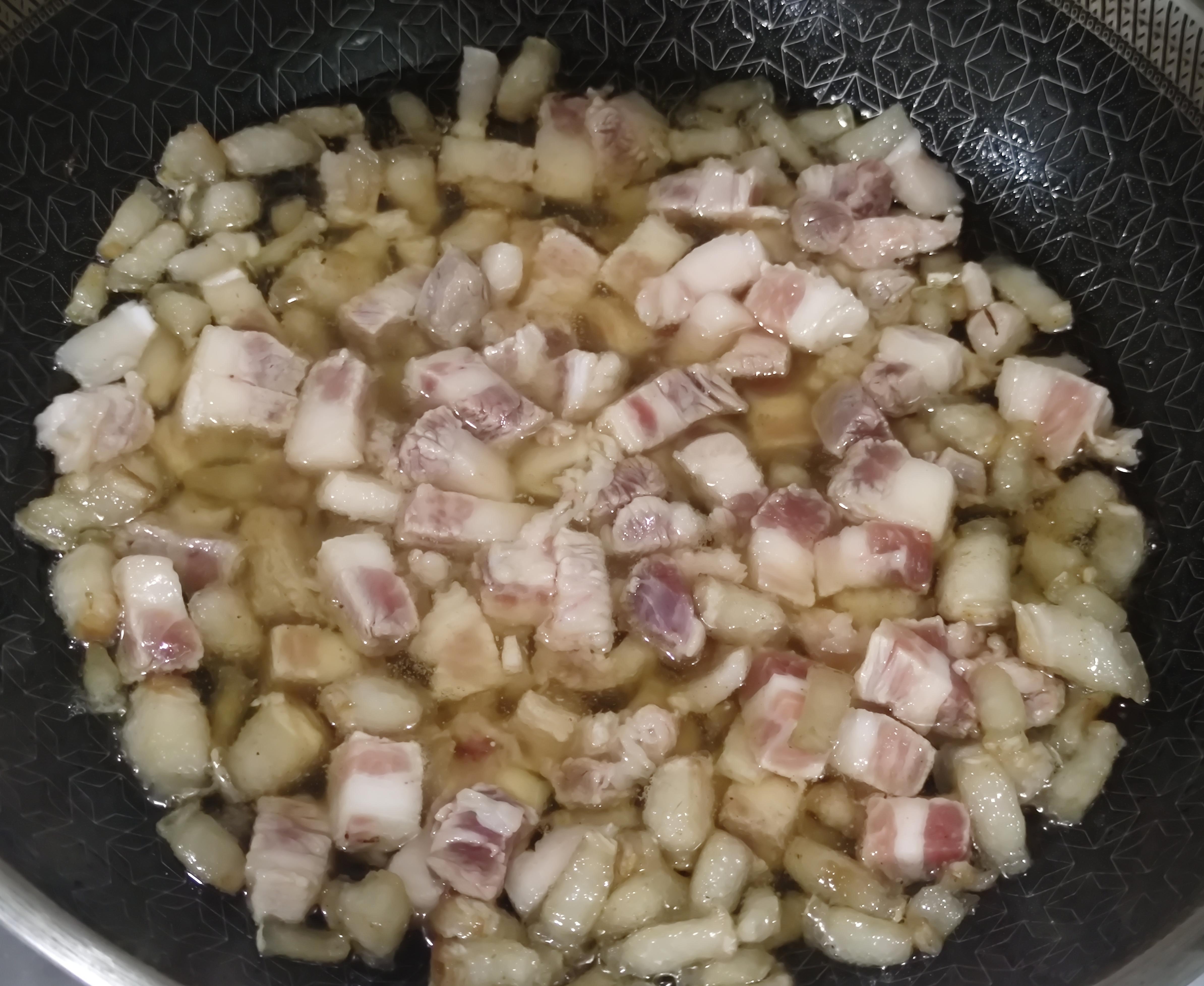 转中小火,先下入肥肉丁煸炒出油,炒至微微泛黄。